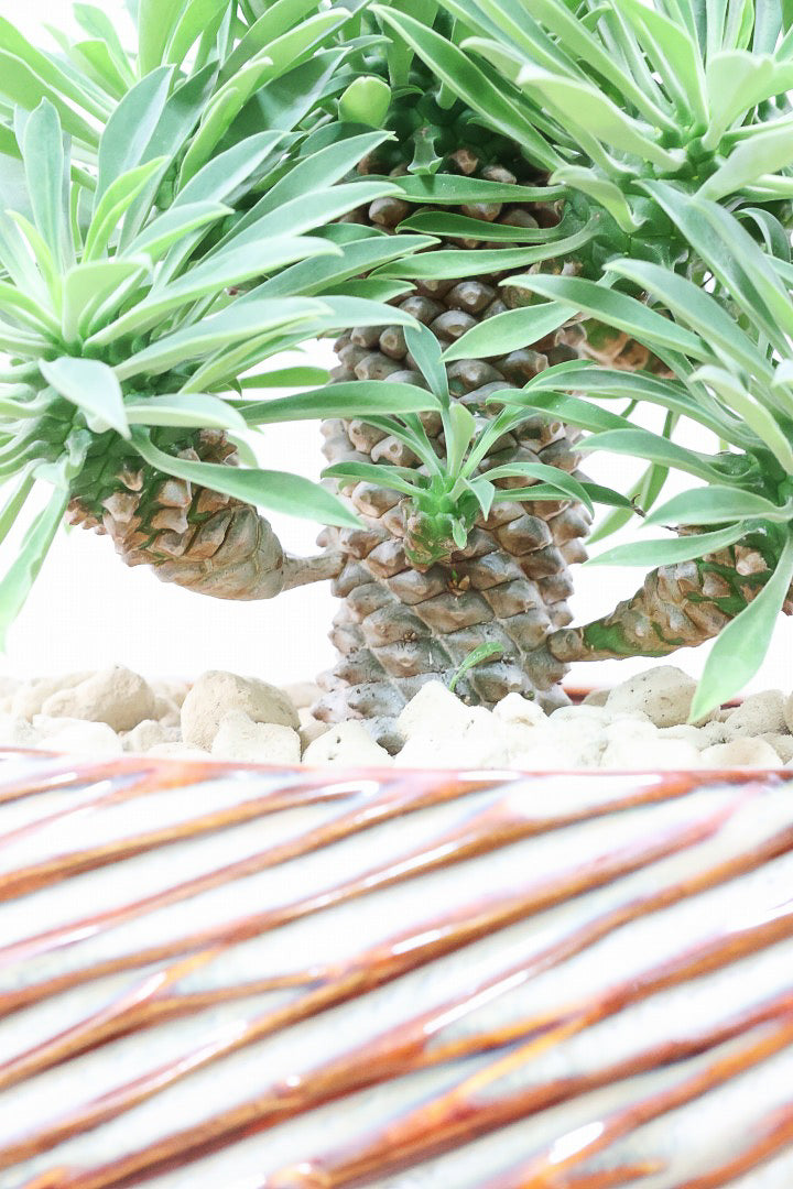 見た目がまるでパイナップルのようなソテツキリン。新しい葉が出るごとに下葉が劣化して落葉するのでこのような姿になります。