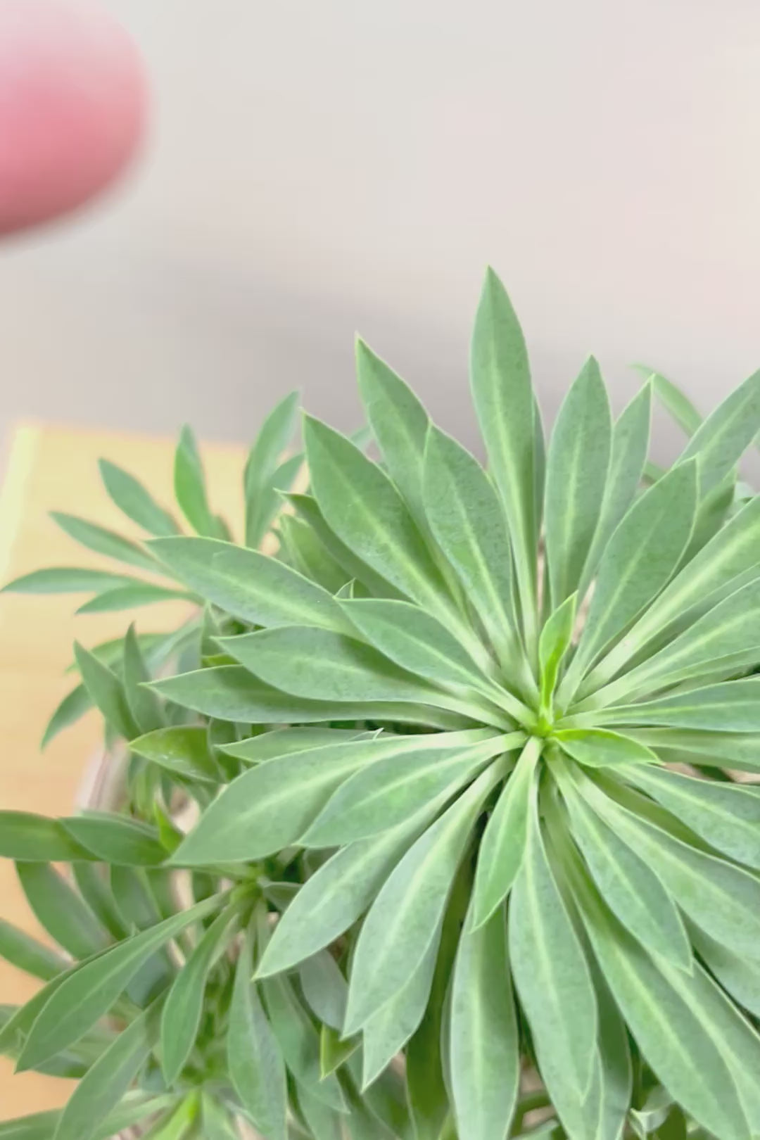 多肉植物なので、春~夏は2週間、秋から冬は1ヶ月の間隔で与えてください。この植物は雨の日に与えると傷む可能性があるので、必ずカラッと晴れた日に水やりをしてください。