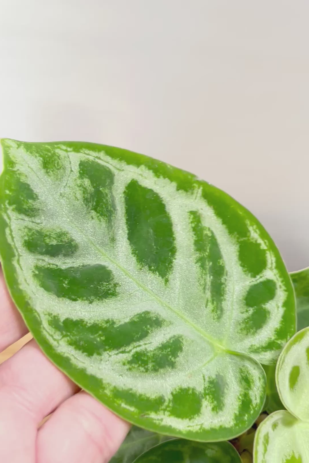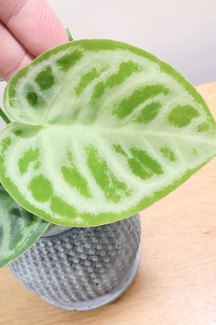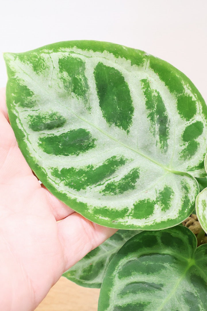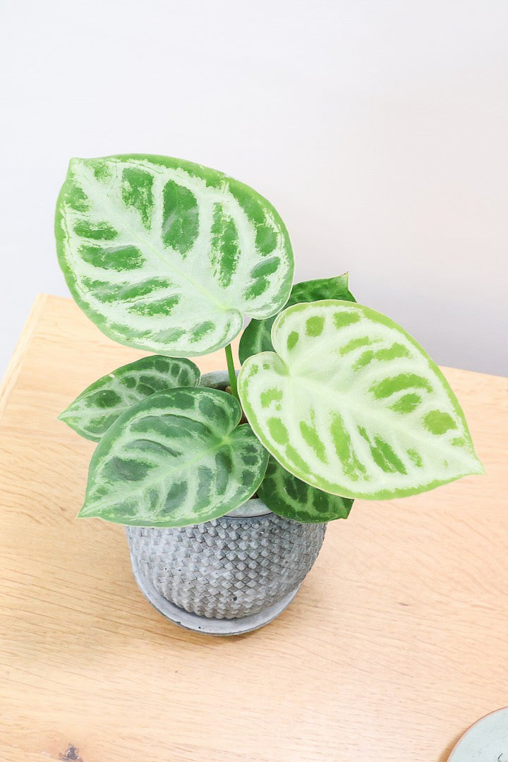 ドラヤキは葉の模様がとても美しく角度によってはあキラキラと光る人気の観葉植物です。存在感があるので人気の観葉植物。会社の開業や移転、お店の開店祝いなどにも人気です。葉はそれぞれ模様が異なるので新芽がでるたびに生長が楽しみな植物です。時間の流れとともにお部屋に馴染んでいく観葉植物です。