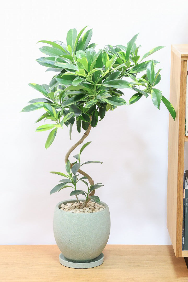 個性的な枝ぶりで、インテリア性があります。また、成長が遅く現在の樹形をキープしやすいのも人気。 葉はダークグリーンのシックな色合いなので、他の観葉植物とは一味違う印象があります。