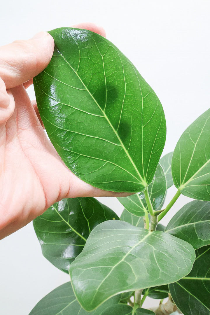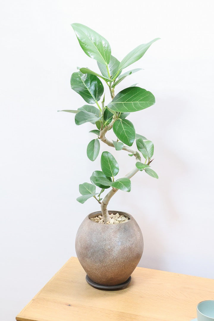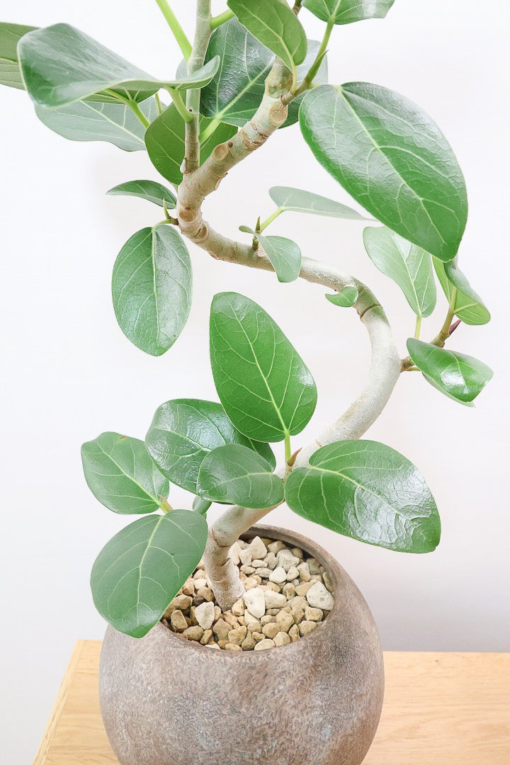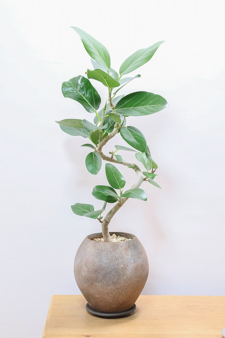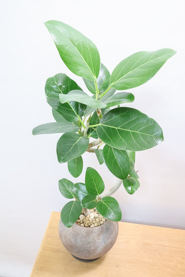 ゴムの木の仲間でとにかく丈夫で育てやすい!!葉っぱ一枚一枚がと大きいので存在感がとてもある植物です。葉の質感は肉厚でとてもしっかりとしています。長い時間をかけて成長する植物ですので、お部屋のインテリアとしてぴったりの植物です。