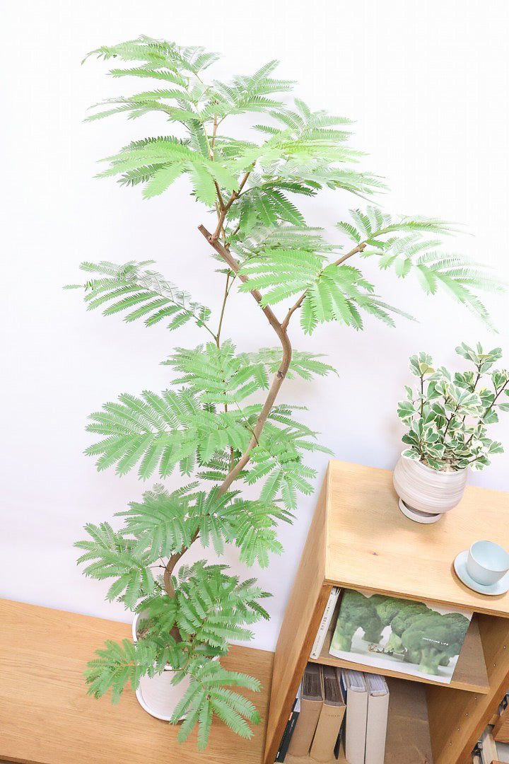 優しいふんわりとした葉が人気のエバーフレッシュ♪葉っぱが小さくとてもキュート♪夜になるとはがパタリと閉じますので、明るい時と暗い時で異なった表情が楽しめる人気の観葉植物です。長い時間をかけて生長し、枝を伸ばしてナチュラルな樹形に変化していくので生長が楽しみな植物です。お部屋のインテリアとしてぴったりの植物です。